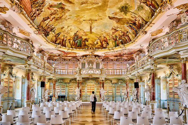 Der Bibliothekssaal des Klosters Schussenried. Mit dem festlichen Bibliothekssaal des Klosters Schussenried schufen der Maler Franz Georg Hermann und der Bildhauer Fidelis Sporer ein Juwel des Rokoko. Bildnachweis: Oberschwaben Tourismus GmbH, Florian Trykowski